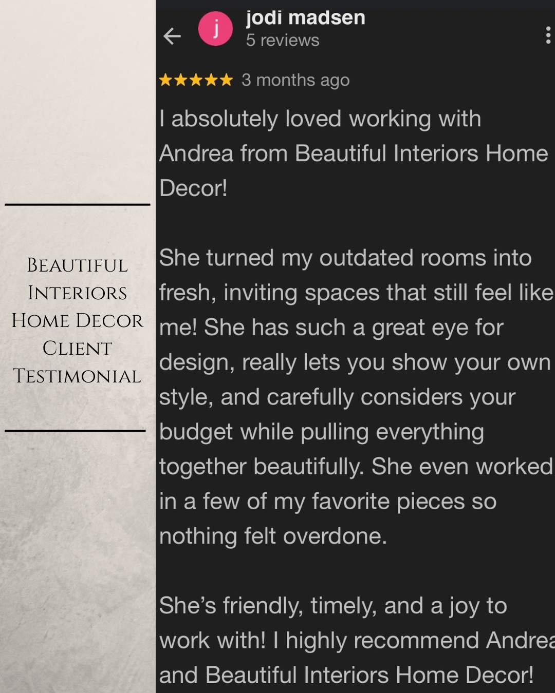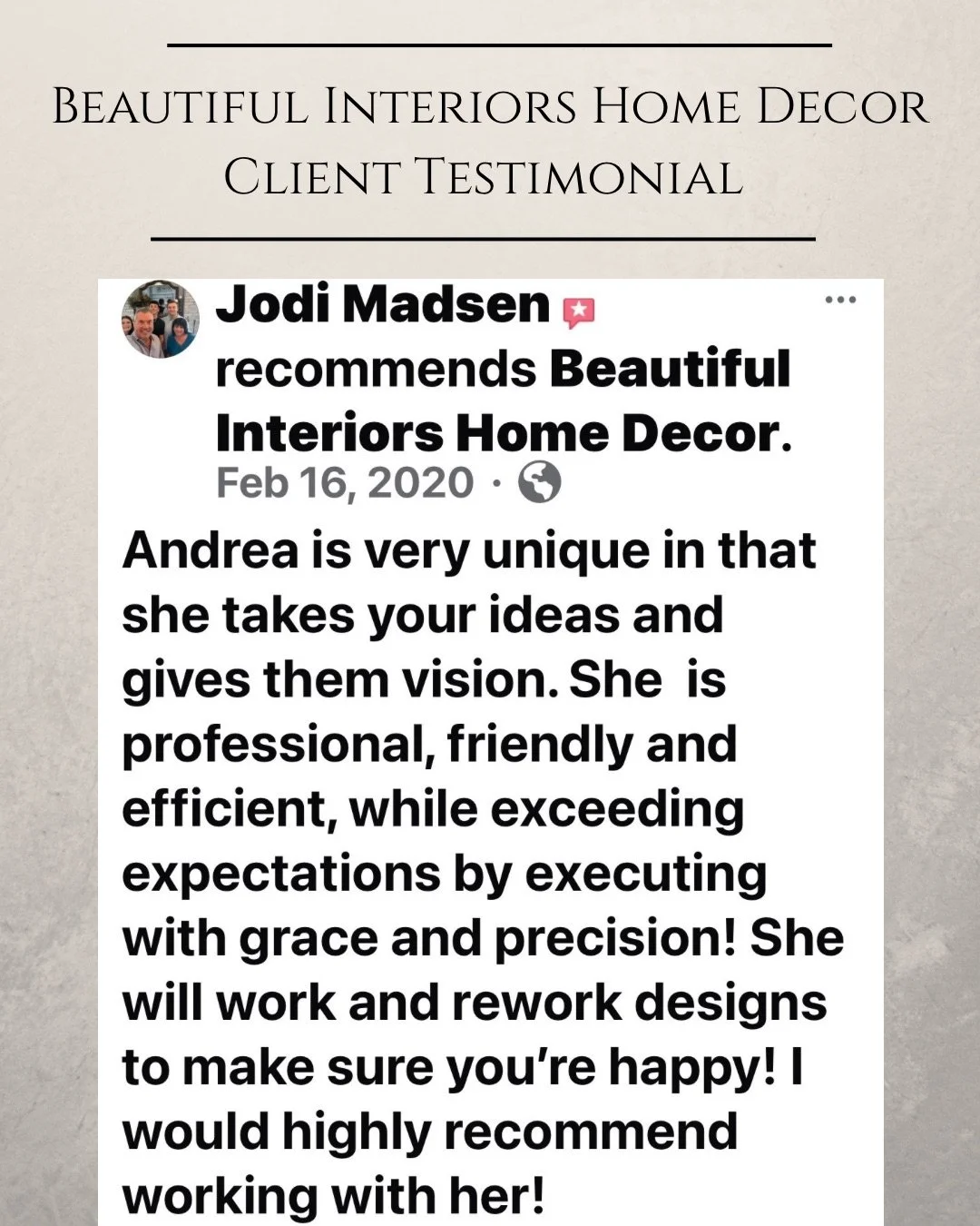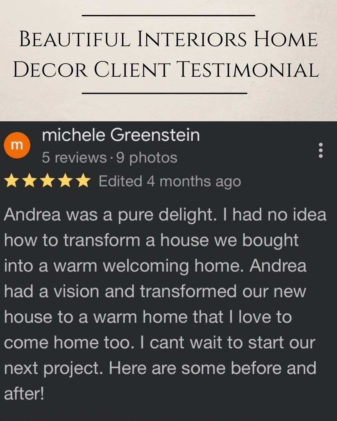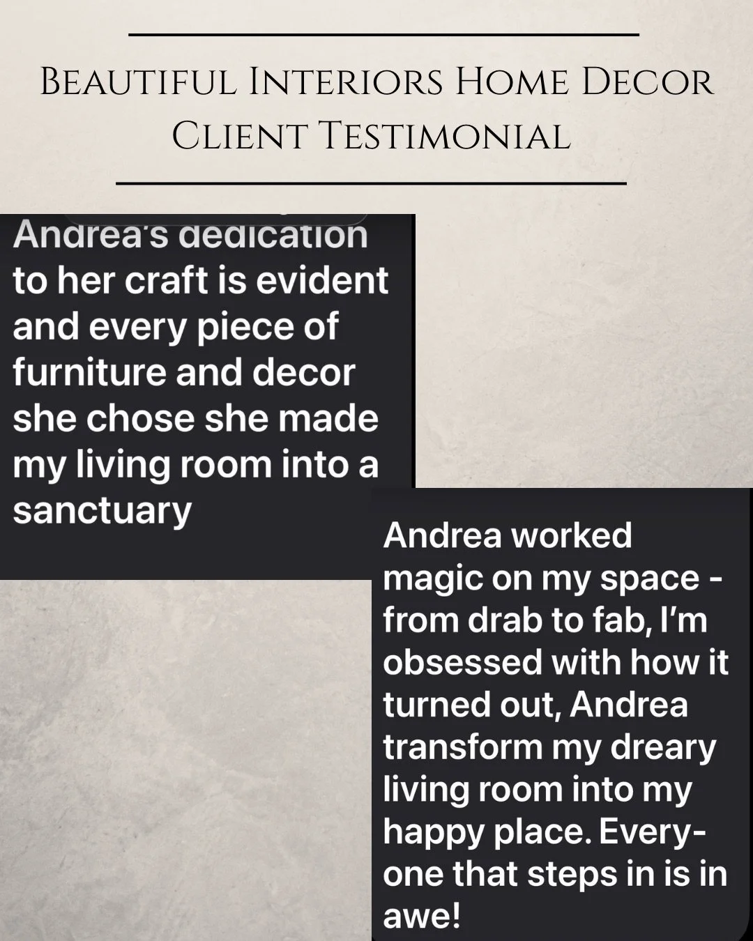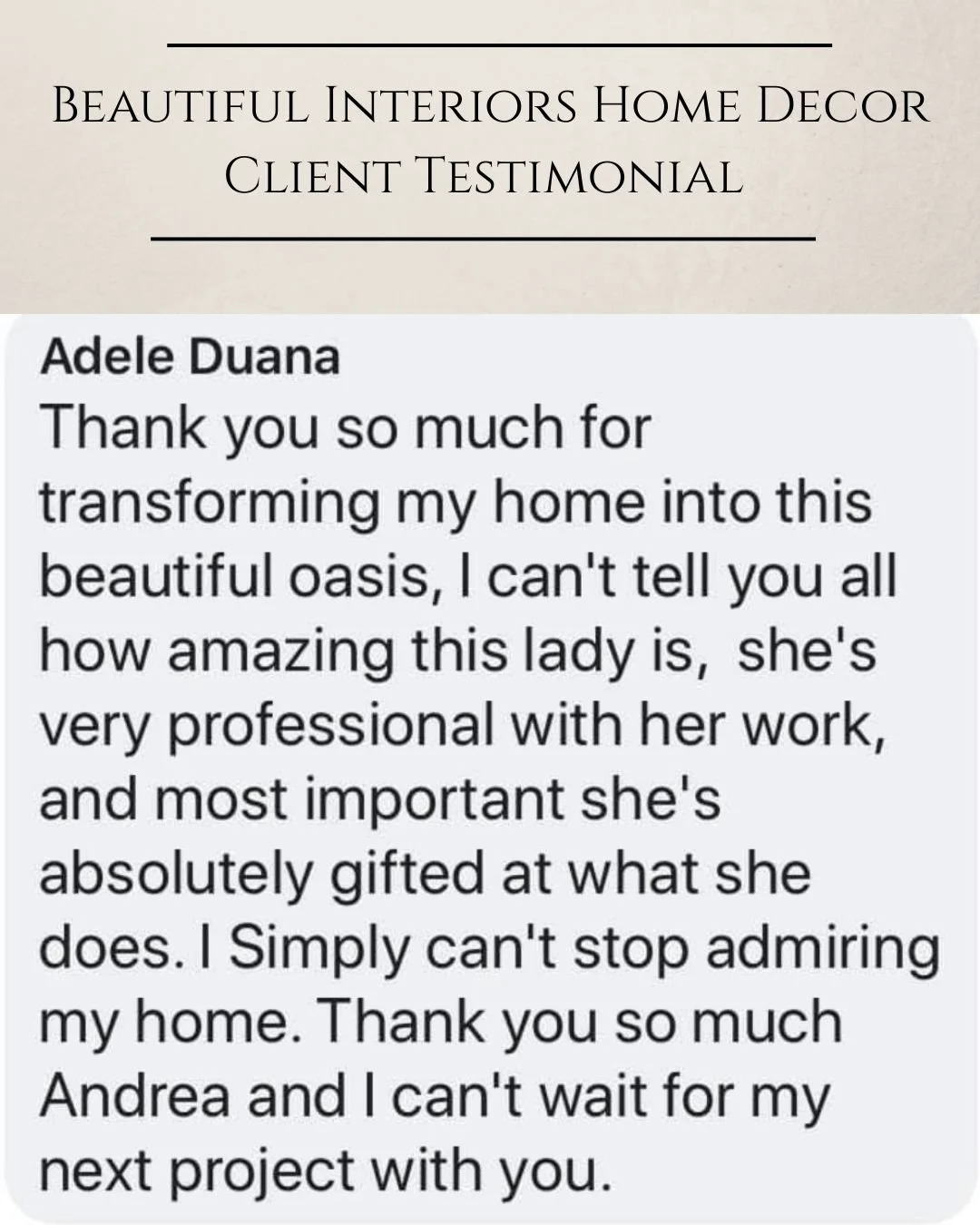 Kind words from my clients mean everything to me. Each space I design is a personal collaboration, and I am grateful for the trust homeowners place in Beautiful Interiors Home Decor. Below you will find feedback from clients as well as professional recognition from vendors who have been inspired by my work.