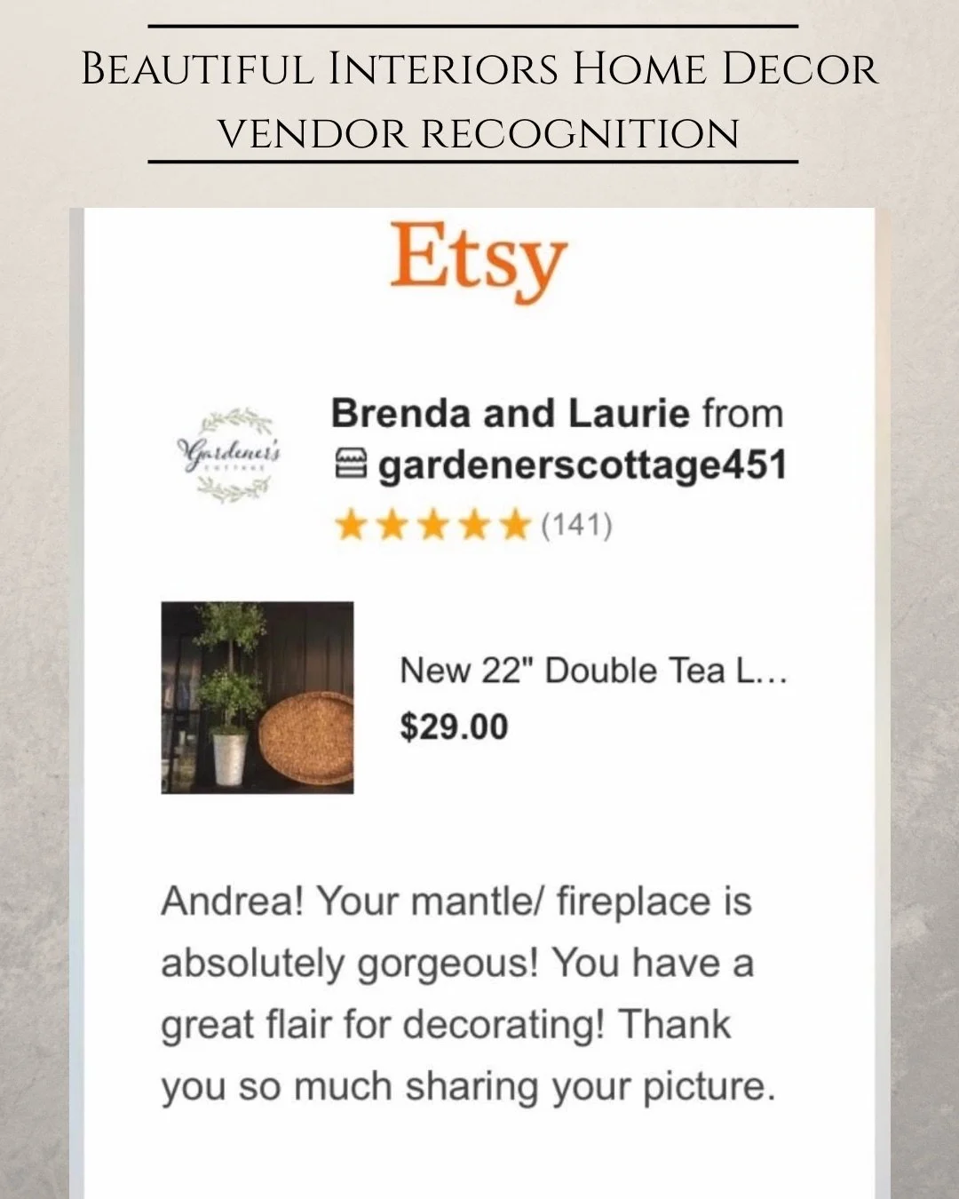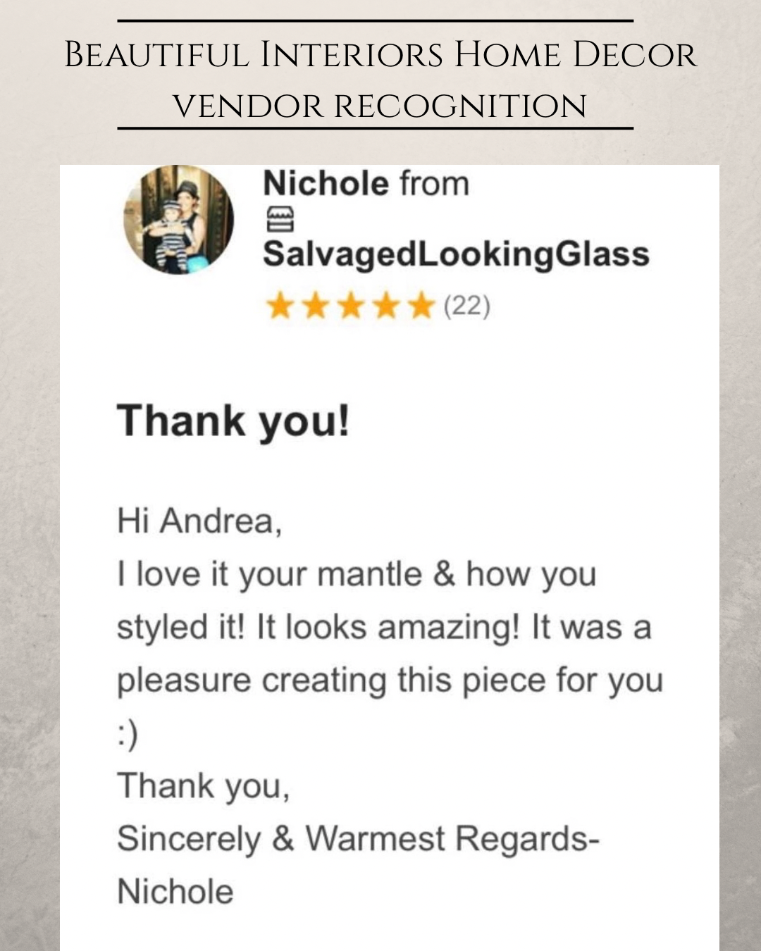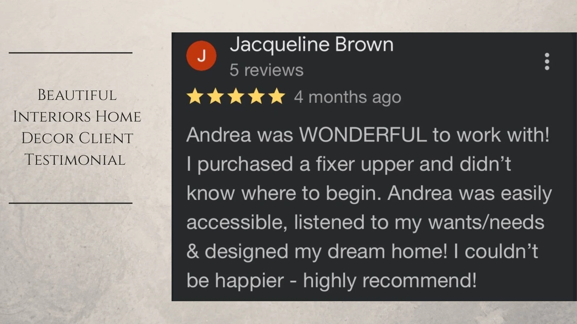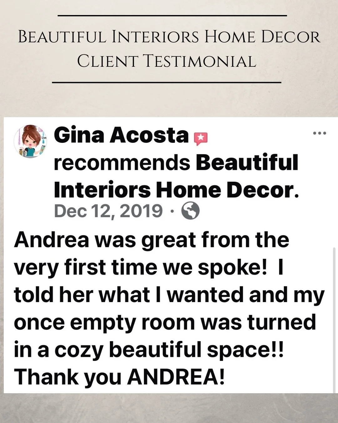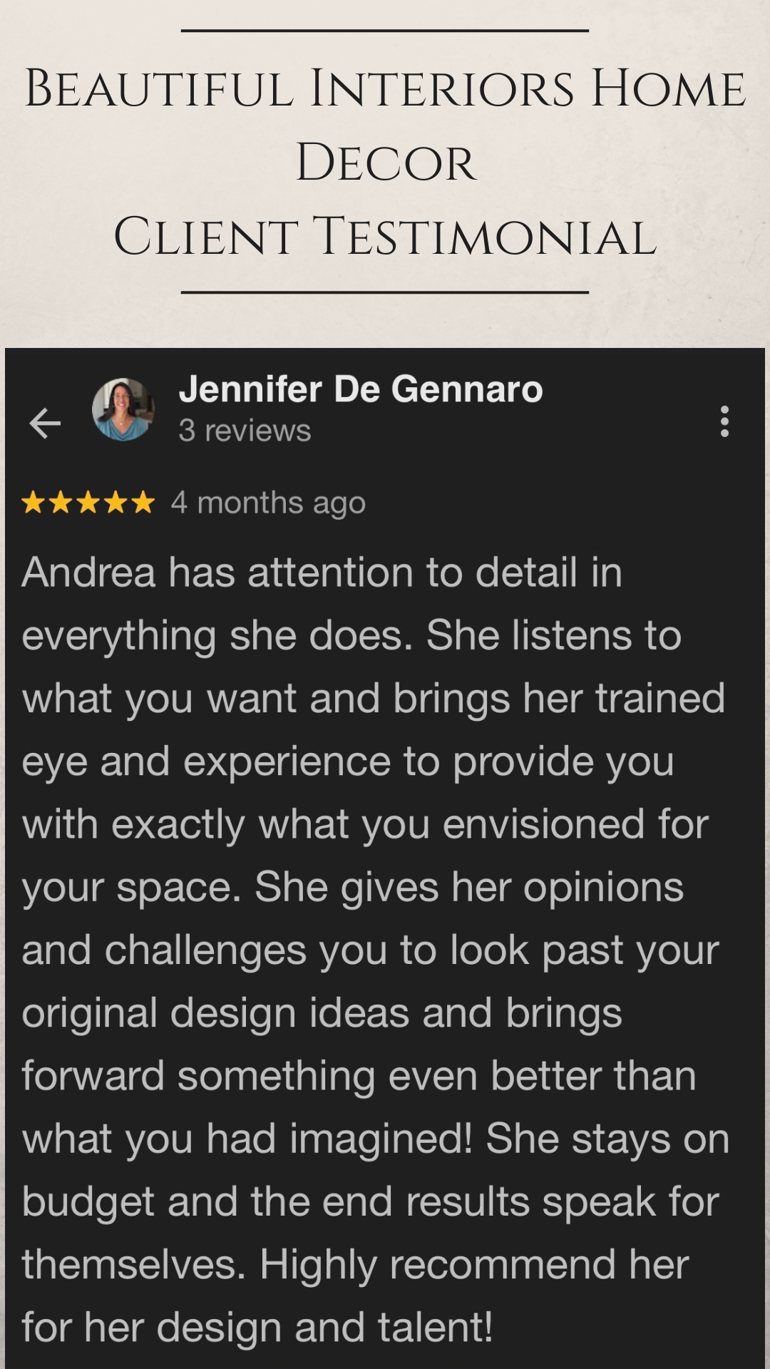 Kind words from my clients mean everything to me. Each space I design is a personal collaboration, and I am grateful for the trust homeowners place in Beautiful Interiors Home Decor. Below you will find feedback from clients as well as professional recognition from vendors who have been inspired by my work.